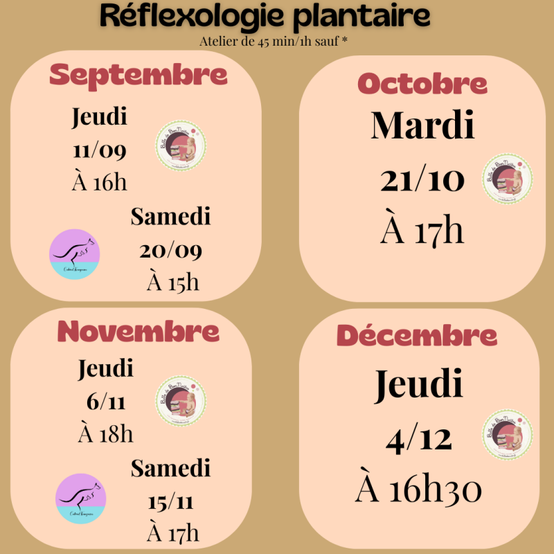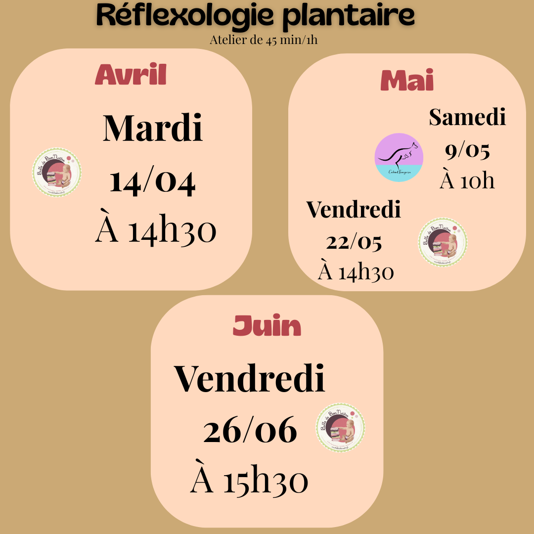 A l'issu de l'atelier, je vous envoie les plaquettes avec les points de réflexologie plantaire et gestes à refaire à la maison.